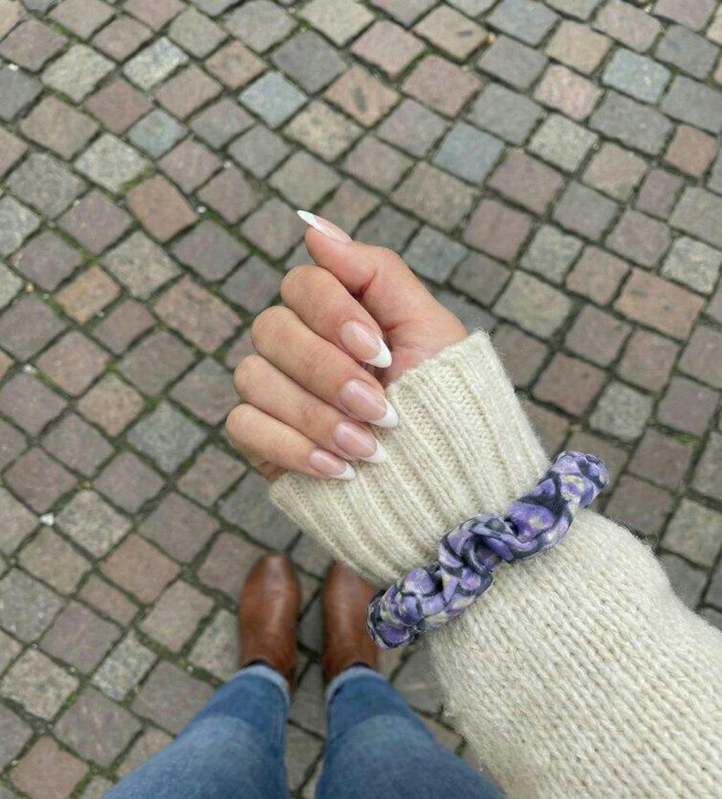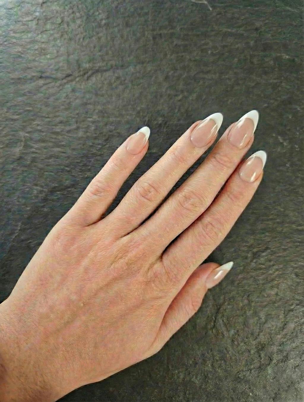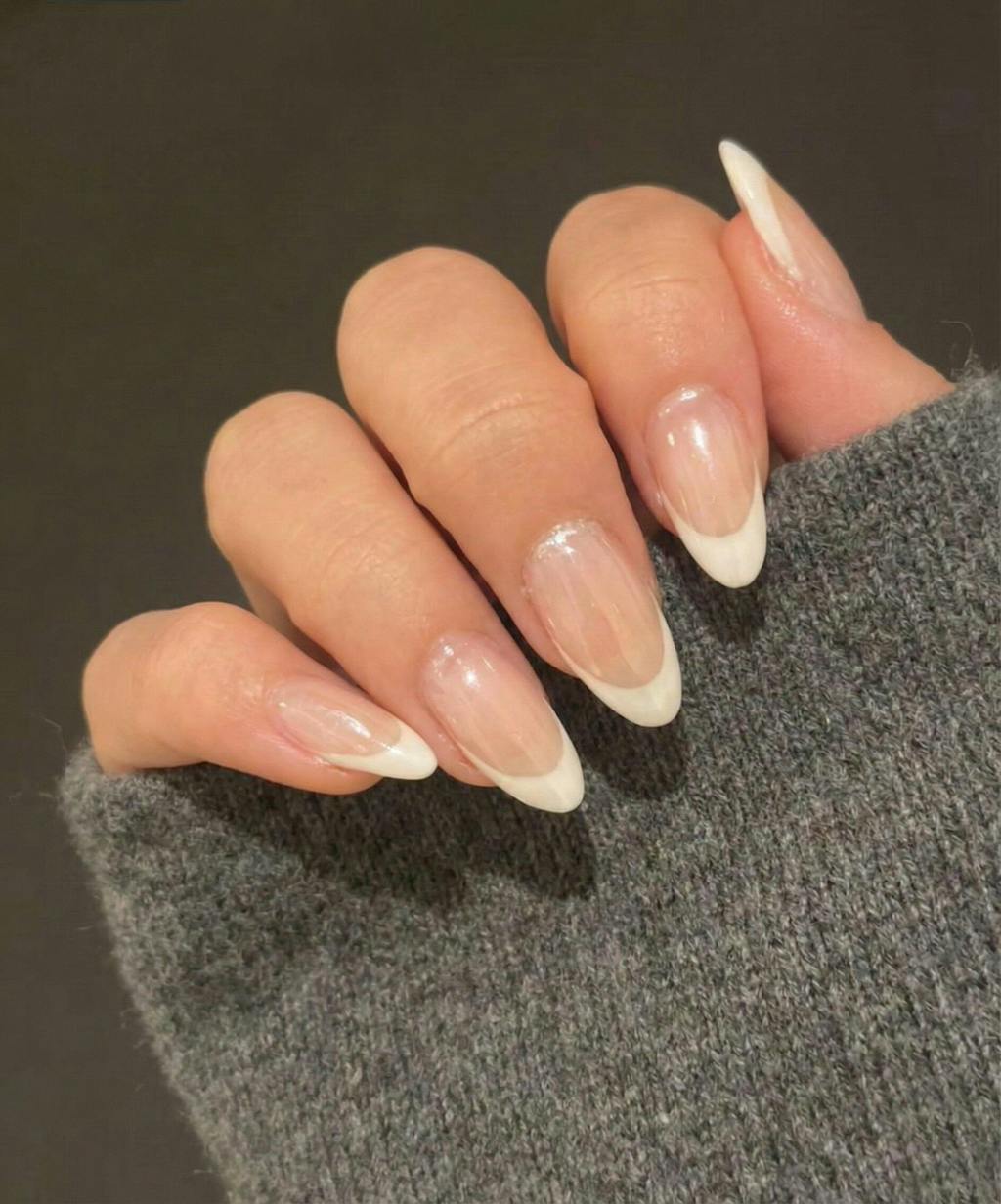 Classic French tips with a modern chrome finish. Handmade short almond shape with a soft pearly shine, stylish for weddings and subtle for everyday wear.