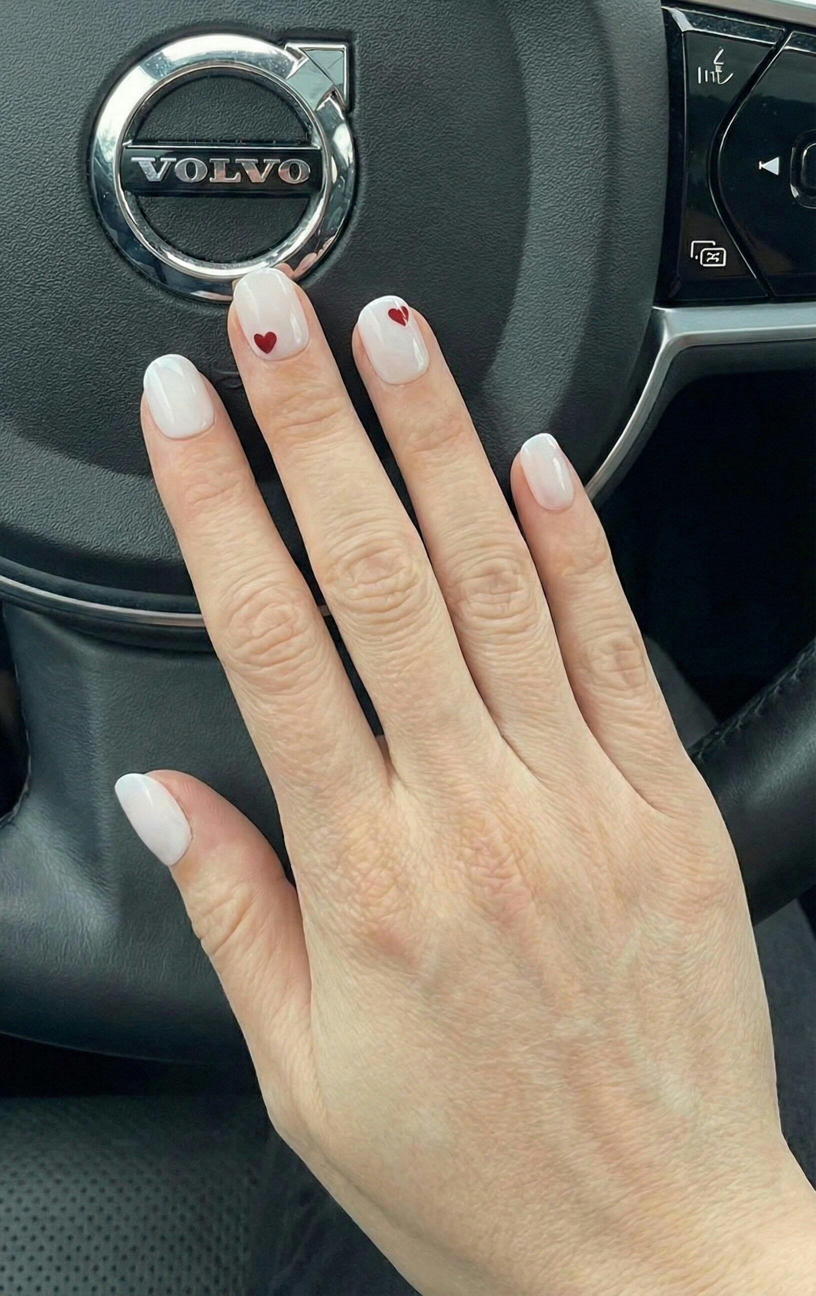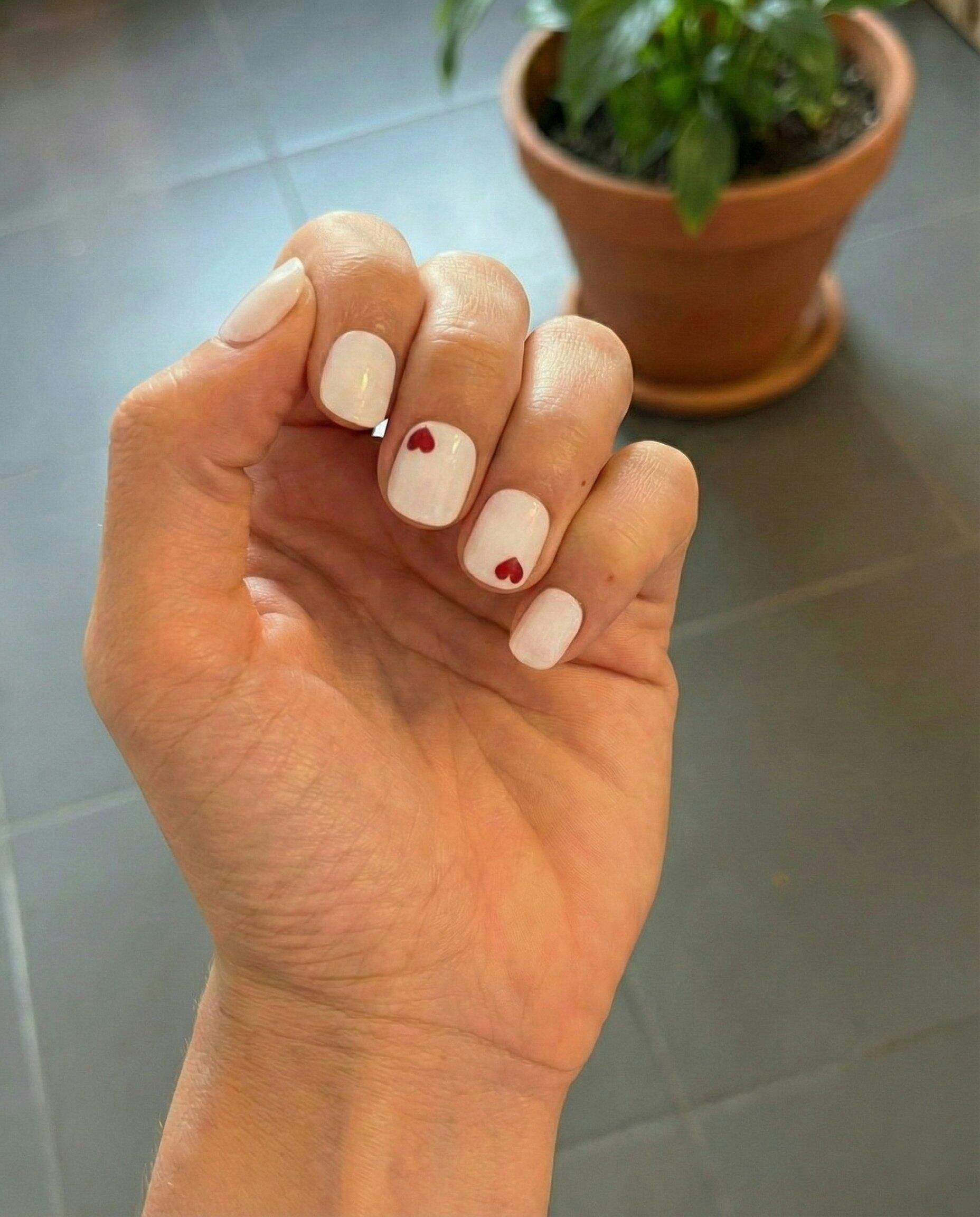 This playful set is all about attention to detail. A soft, clear background meets delicate heart motifs for a look that is sweet yet bold. Wear it as a solid set or with heart details - perfect if you want to show romance. In a super short square shape for minimalist or romantic vibes.