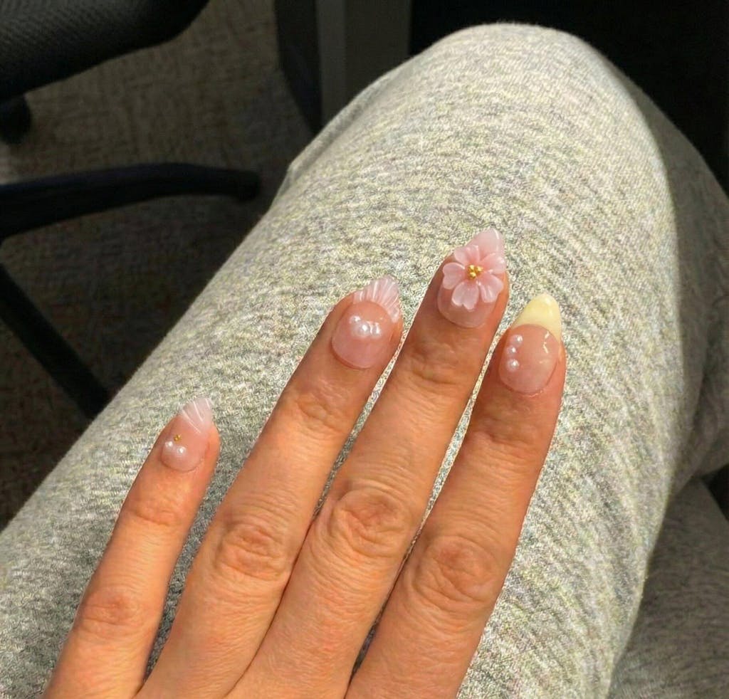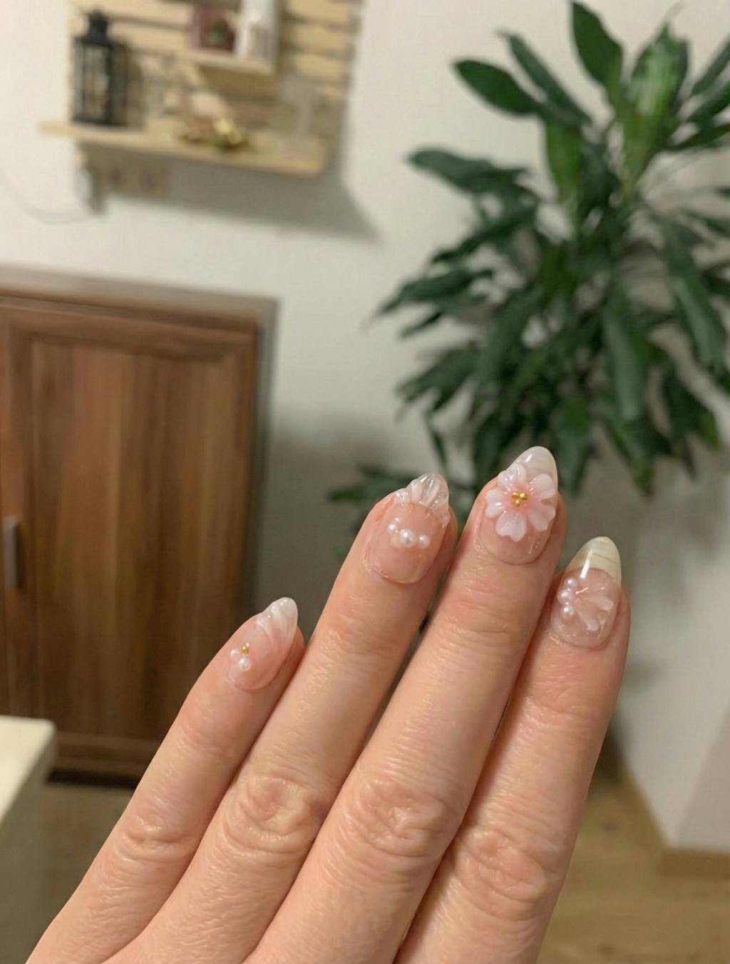 Sakura 3D Press Ons: 100% handmade, reusable 3D press-ons in short round shape. Featuring soft pink sakura florals, pearl accents, and shell textures — a perfect match for warm weather and carefree days.