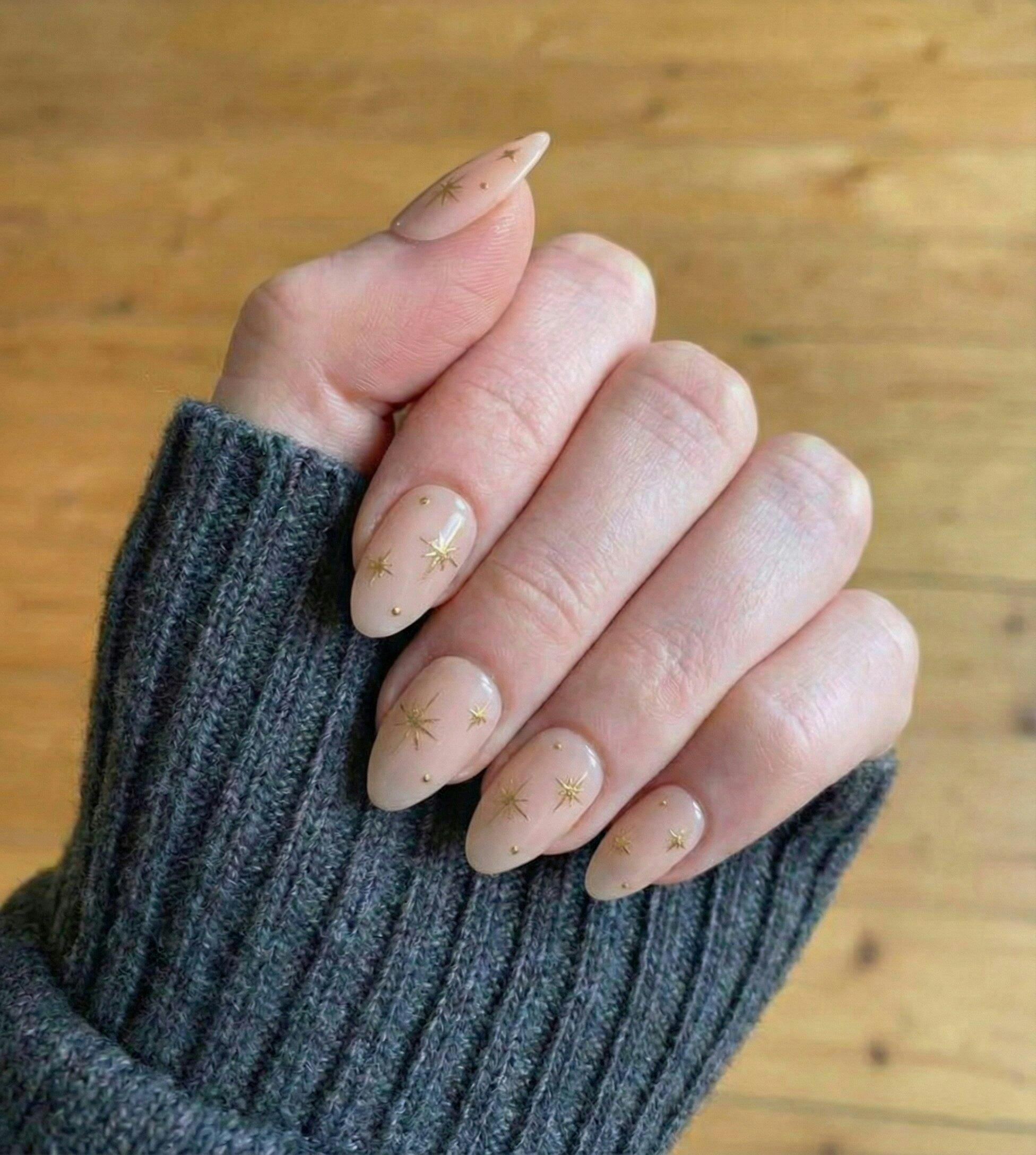 Star Ray Press Ons: 100% handmade, reusable press-ons in short almond shape. Crafted by nail artisans with golden starburst designs on a soft nude base — radiant and timeless.