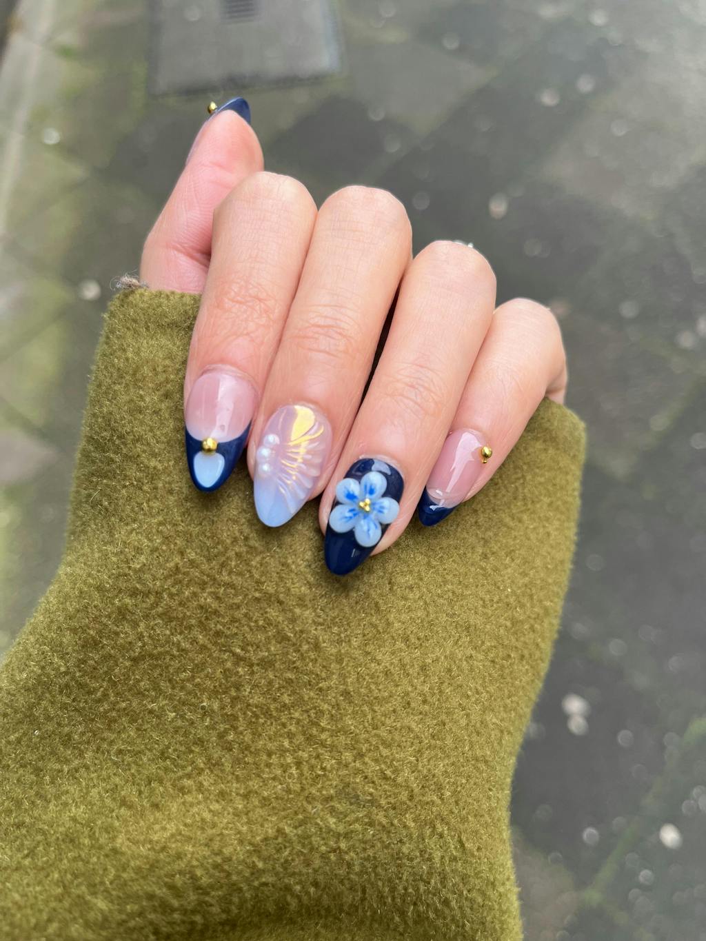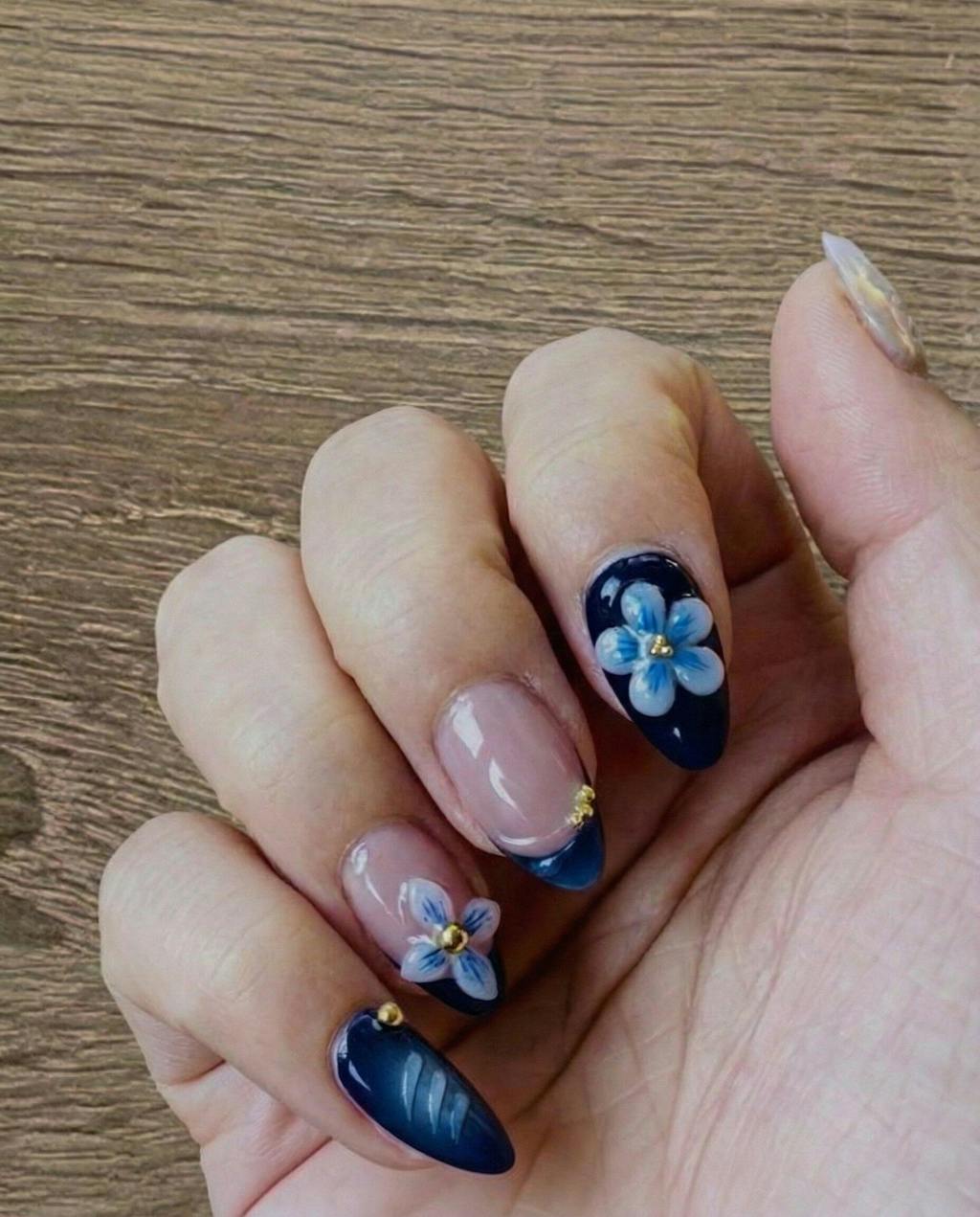 Navy Tide 3D Press-Ons mit tiefblauem und nudefarbenem Marmor-Effekt, goldenen Details und 3D-Blumen. Handgemacht, wiederverwendbar und in kurzer Mandelform – für maritimen Chic mit floraler Eleganz.