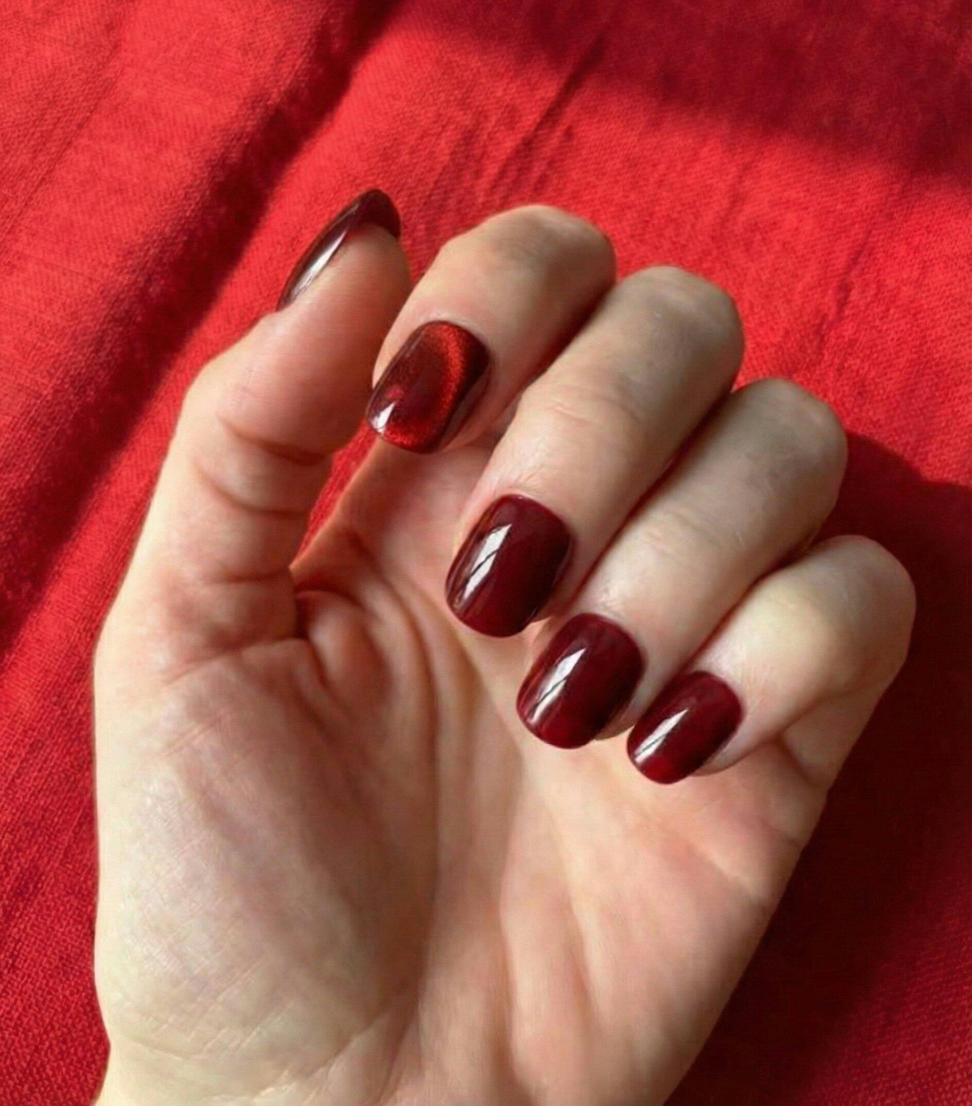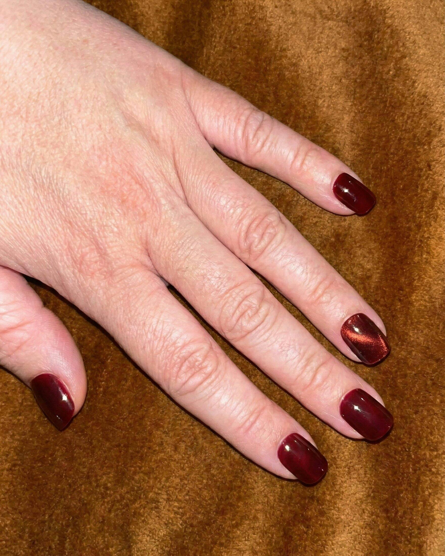 Ruby Flame Press-Ons: Handgefertigt und 100 % wiederverwendbar, erhältlich jetzt auch in Extra Kurz Square. Die einzigartige ‚Crimson Eclipse‘ Cat-Eye-Farbe mit schwarzer Basis sorgt für faszinierende Tiefe und edlen Glanz. Ideal für einen stilvollen, praktischen Look, der zeitlose Eleganz an deine Fingerspitzen bringt.